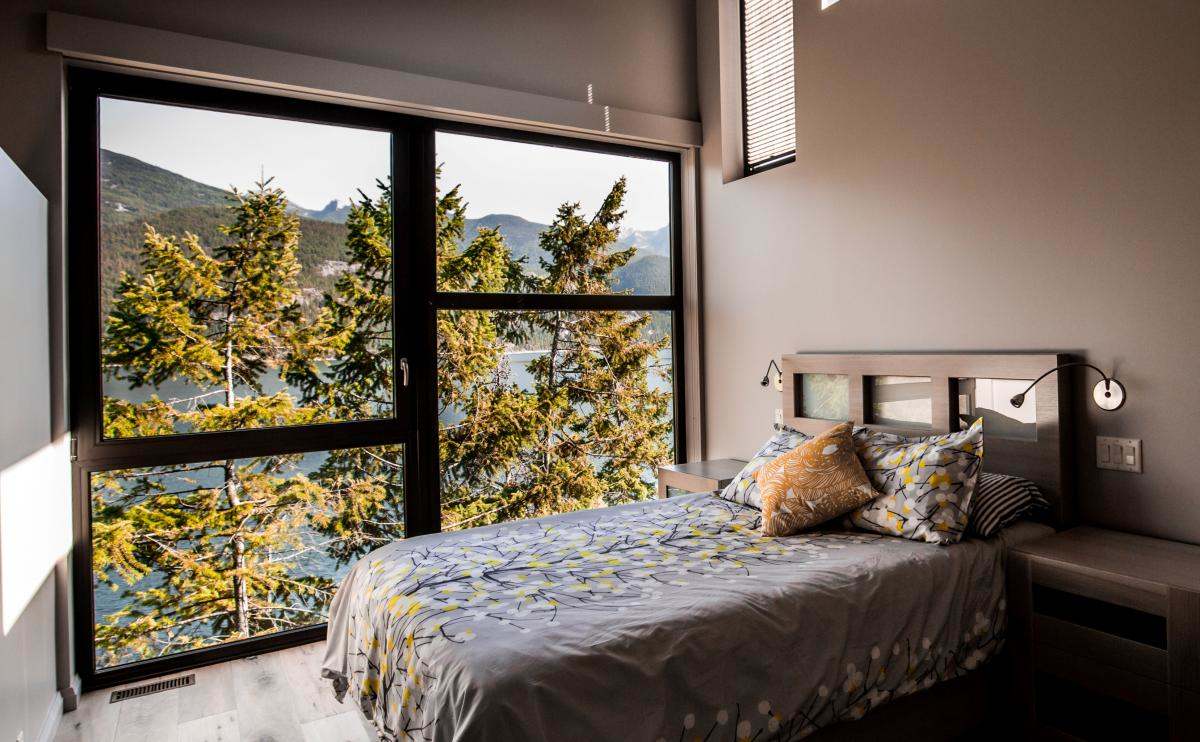 The result is stunning: looking out the large windows to the lake below, the trees make the house look like it’s suspended in the air, floating in the tree tops. Here’s the spectacular view from the master bedroom: