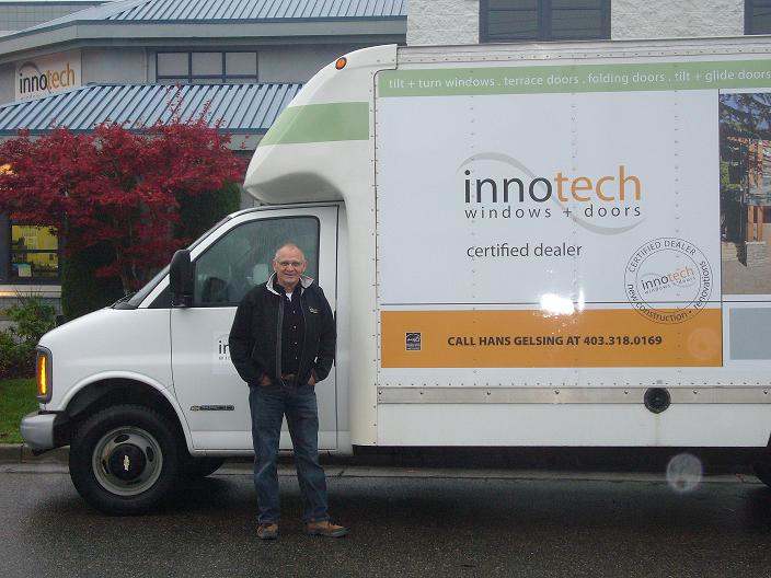 Doing business in and around the Red Deer area, Hans Gelsing, one of our dedicated dealers in Alberta, now has a new vehicle wrap for his delivery truck. Having worked with Innotech for nearly two years, Hans wanted to spread the word about Innotech windows and doors. To help him out, we designed a eye-catching vehicle wrap with as much pizzazz as Hans himself!