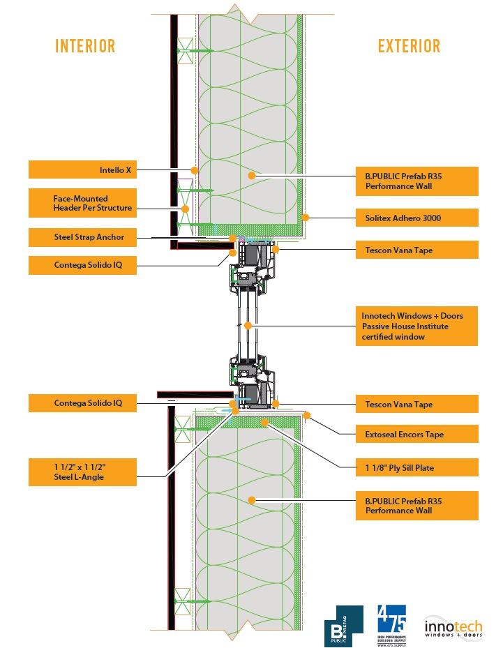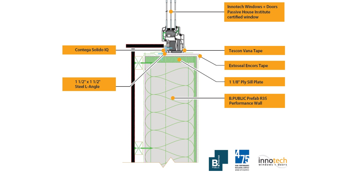 The Defender 88PH+ window system manufactured by Innotech Windows + Doors is engineered for seamless integration into the B.PUBLIC Prefab R35 Performance Wall, a high-performance panelized wall assembly designed for exceptional energy efficiency, airtightness, and durability. Together, these systems create a resilient enclosure solution that delivers consistent results—whether assembled in a factory or installed on-site.