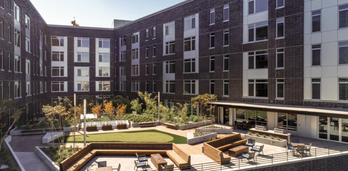 One of the many breathtaking amenities at the RiverWest Apartments is the expansive courtyard on part of the third storey. With a putting green, fire tables surrounded by ample seating, and lush landscaping, the courtyard offers residents a private outdoor oasis with dramatic views.