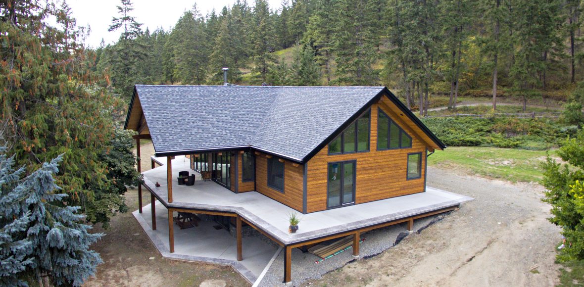 In addition to the striking timber frames and wood craftsmanship, one of the home’s standout features is the living room. Featuring floor to ceiling windows and doors, the living room has two sets of double Tilt + Turn Doors with fixed side windows. These doors open to a large outdoor living area and wraparound porch.